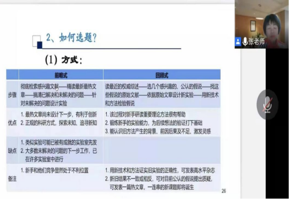 随着研究生招生数量和规模的不断扩大,硕士研究生学位论文的质量问题已引起学界的普遍关注。影响硕士研究生学位论文质量的因素是多方面的,其中硕士研究生学位论文的选题是一个重要的直接影响因素。在讲座中,张老师围绕“什么是好选题”、“如何选题”、“如何更有创意地表达选题”、“几点创新”等主题深入浅出地开展了交流,并演示了具体操作。除此以外,张老师还对“加强研究生教育工作的重要性”、“研究生自身定位”、“自身规划及时间管理”等内容进一步拓展了讲座内容。